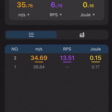 Record the data of EACH SHOT, showing in m/s, RPS, joule and other you wanna know.