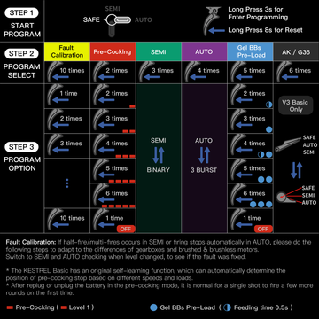 - Pre-cocking Adjustment: Different 5 pre-cocking levels to programming. The KESTREL Basic have learning function which can automatically determine the position of pre-cocking stop based on different speeds and loads. It is normal for a single shot to fire a few more rounds after replug or unplug the battery.